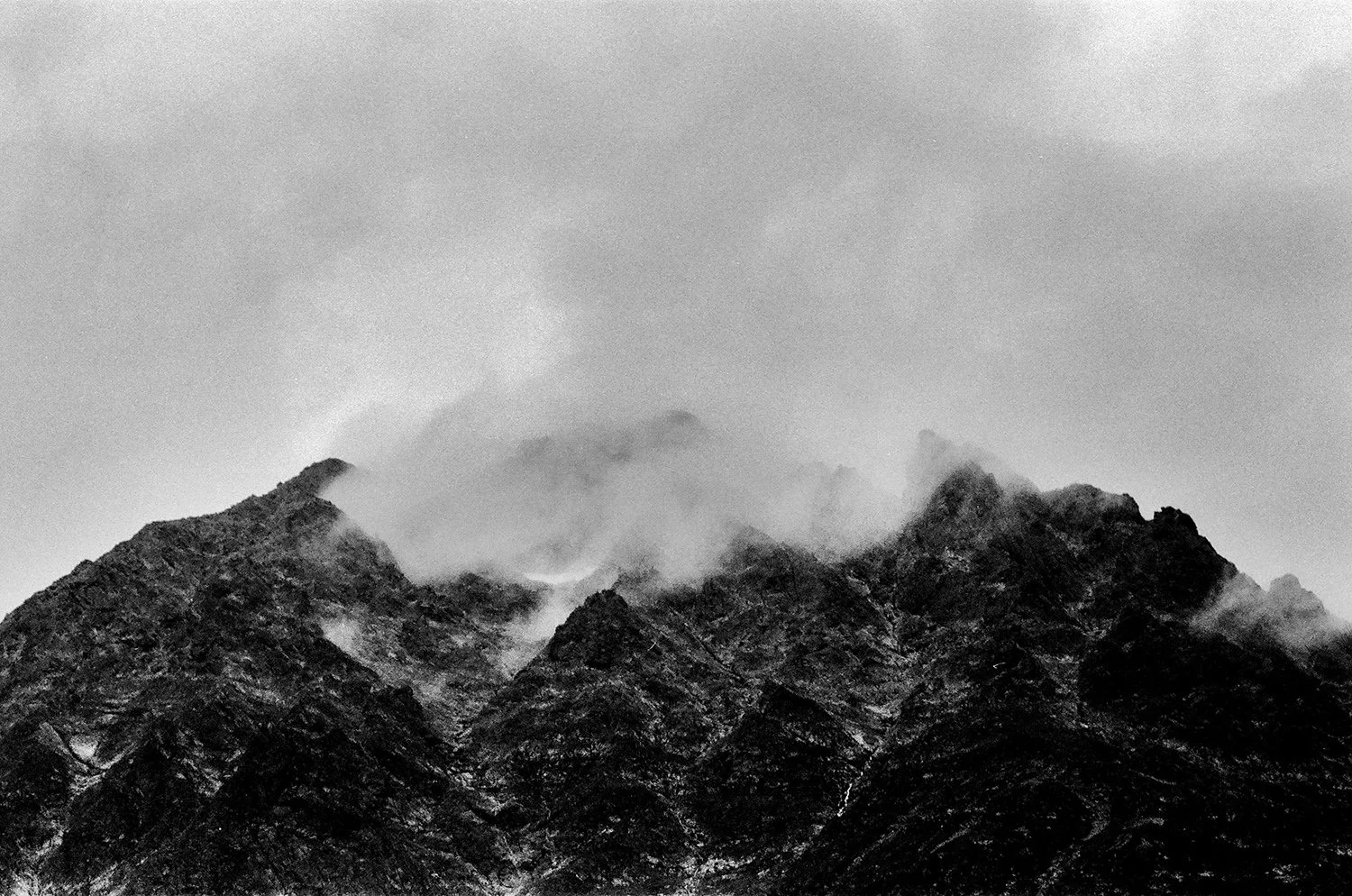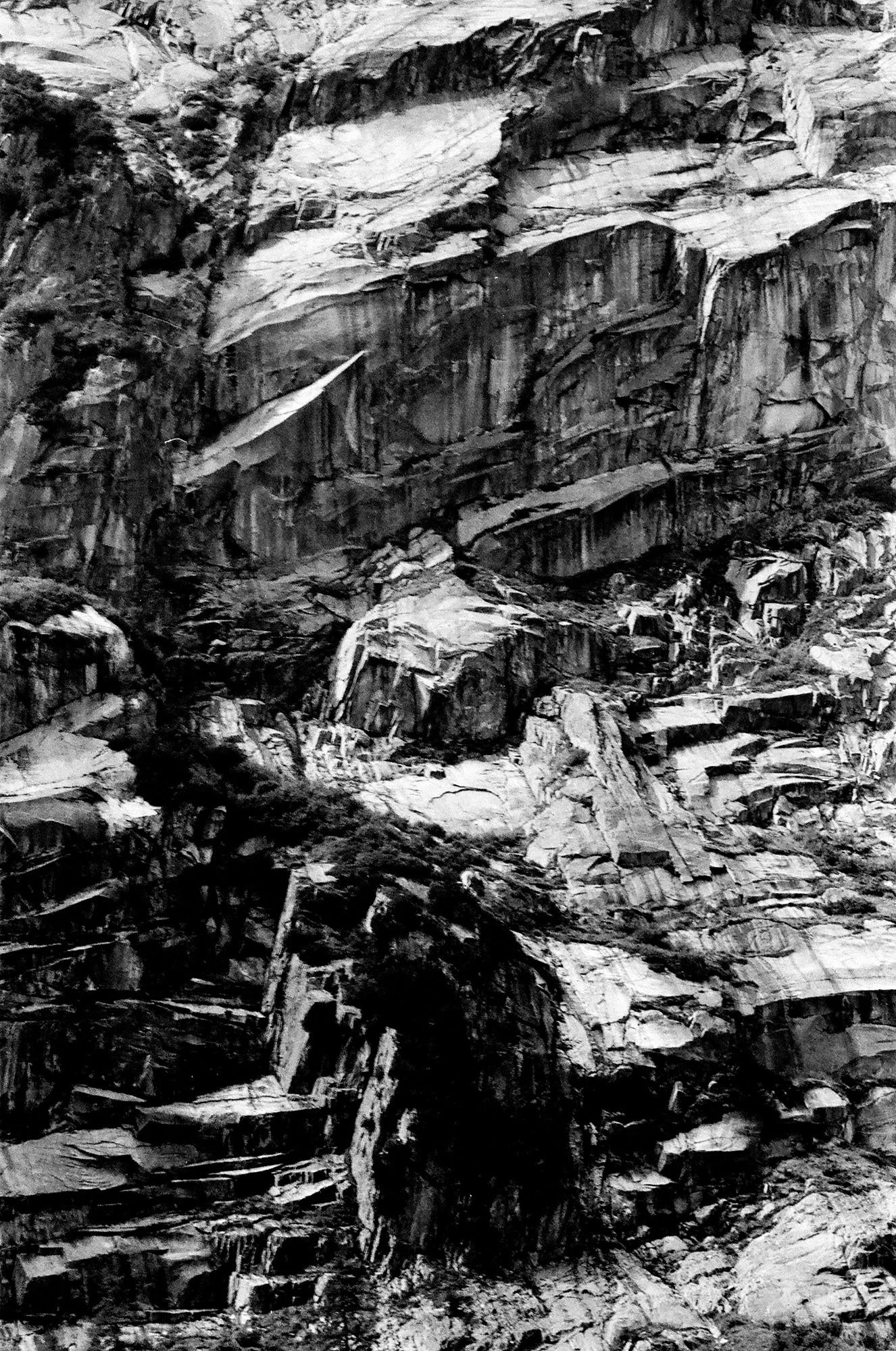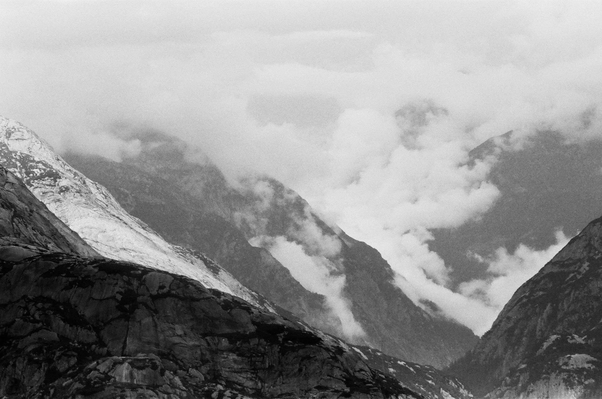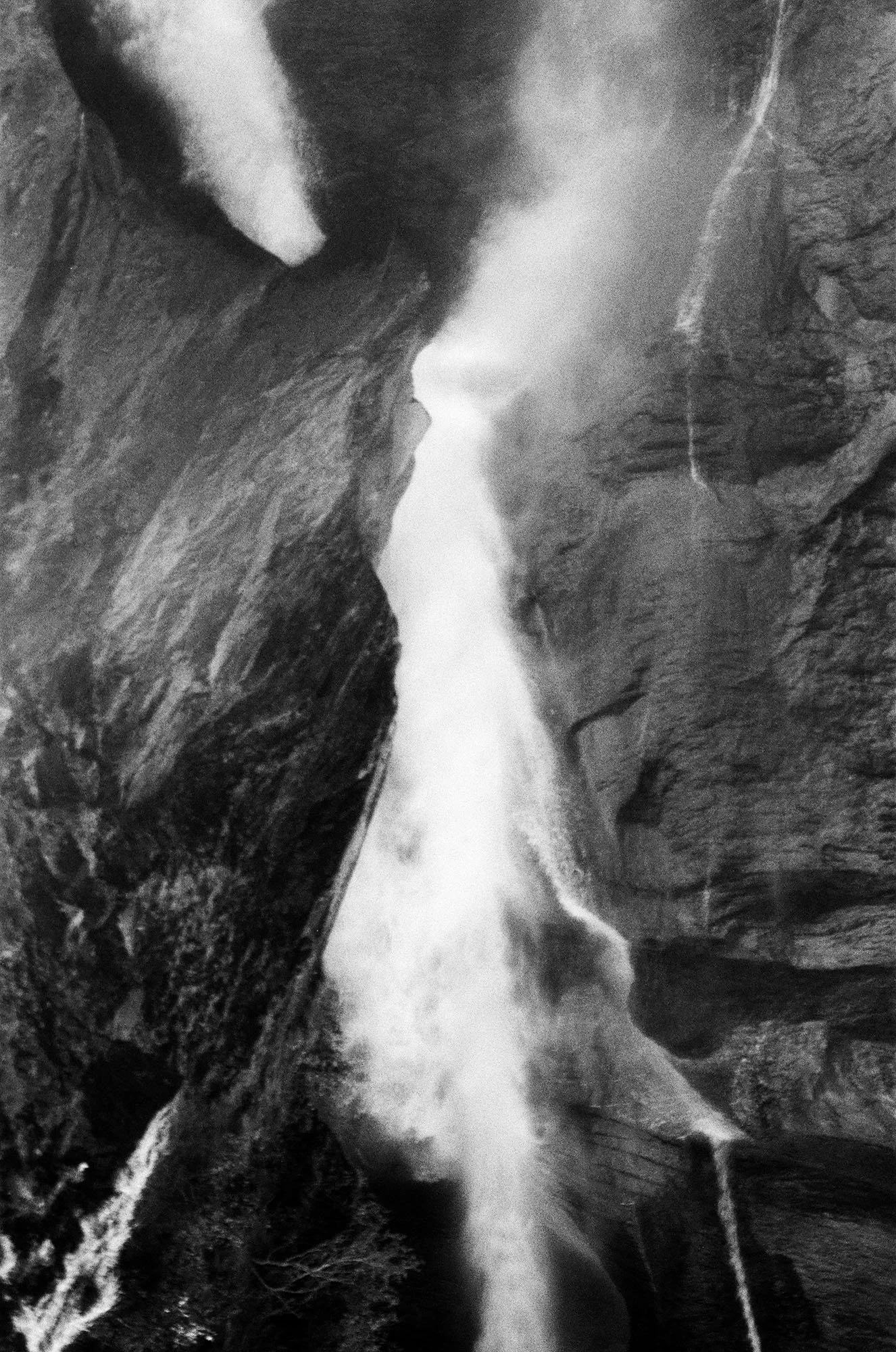 In this series, I approached the mountains as living beings. They appear to be in constant motion due to the changing light and the clouds hovering above them. While the mountains of Switzerland are typically associated with the picturesque, I aimed to reveal the ruggedness of the landscape. After extensive driving, climbing, and walking, it felt as though the mountains were 'coming at me'. I felt dizzy and light-headed. This force of nature overwhelmed me. The landscapes are isolated, and most of the photographs lack any trace of humans, creating an alienating effect. By using black and white film, I emphasize the roughness and purity of the surroundings.